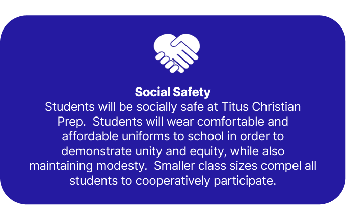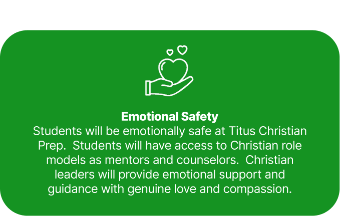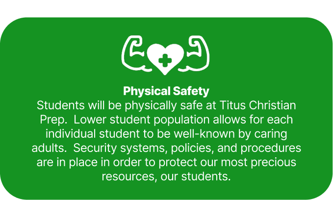 Titus Christian Prep aspires to cultivate a positive, Christ-centered community that develops students in heart, mind, soul, and strength. We nurture the heart through a caring Christian environment, equip the mind through excellent academic preparation for future careers, strengthen the soul through faithful teaching of God’s Word, and build physical strength through healthy habits and purposeful activity.